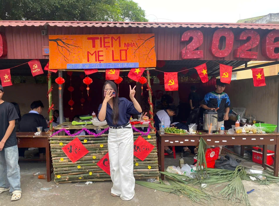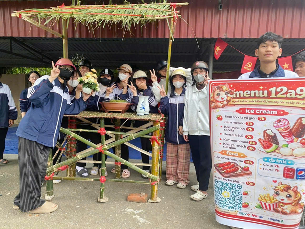 Từ sáng sớm, khi những tia nắng đầu tiên vừa len qua hàng cây, các bạn học sinh đã có mặt đông đủ để bắt tay vào dựng trại và trang trí gian hàng. Mỗi lớp chọn cho mình một phong cách riêng nhưng đều mang đậm hơi thở của phiên chợ Tết xưa: câu đối đỏ, mẹt tre, lá dong, bánh chưng xanh, bao lì xì, đèn lồng và những tấm biển viết tay mộc mạc.